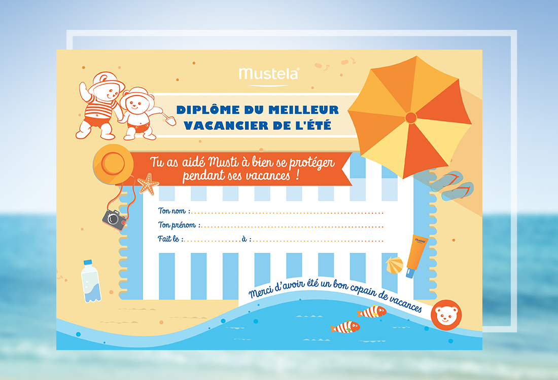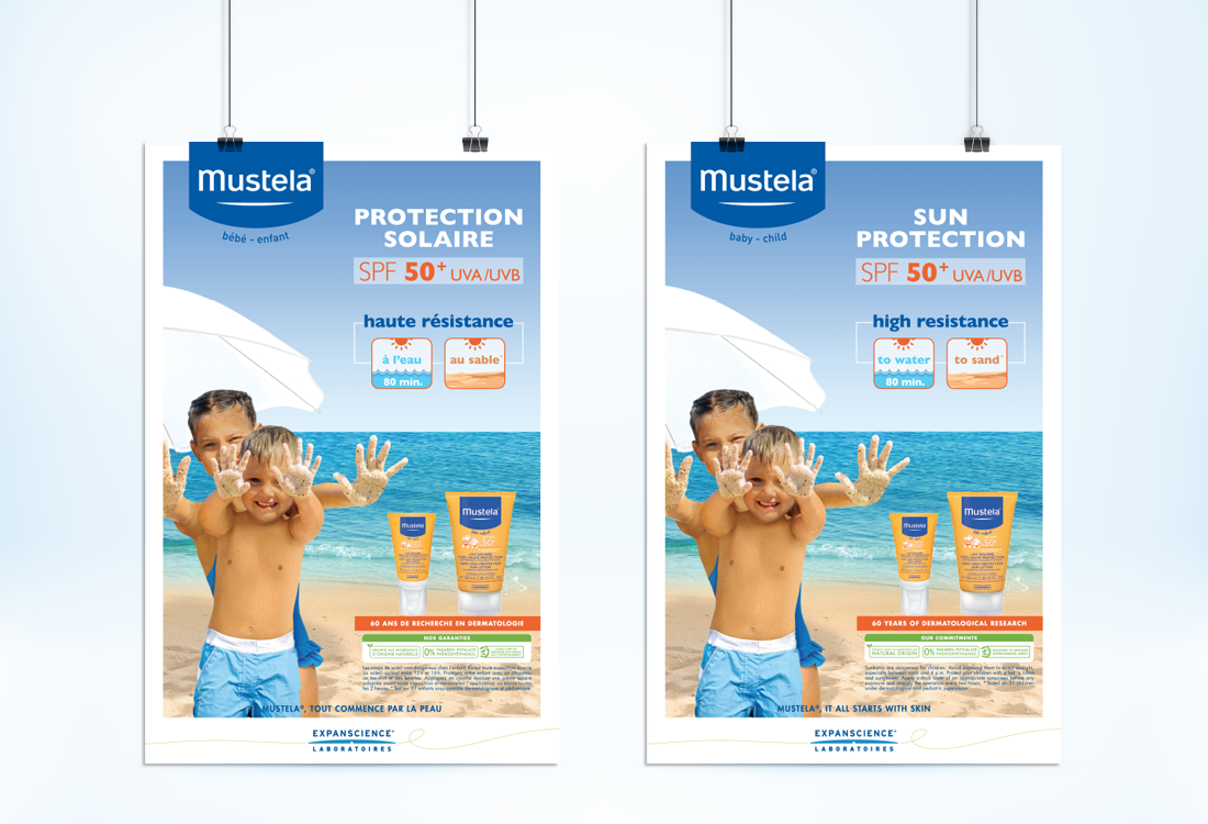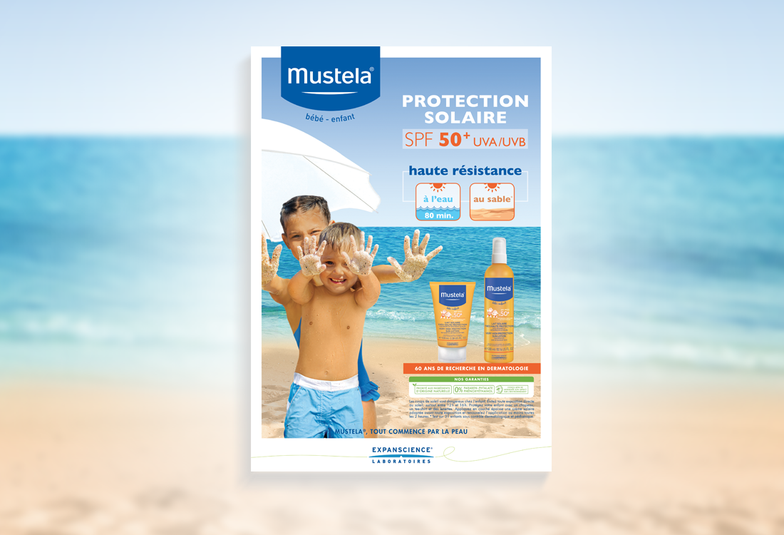 Mission : Création du Key Visual de la campagne solaire enfant Mustela®. Retouches photos, montage, création et déclinaison du key visual sur différents supports print.